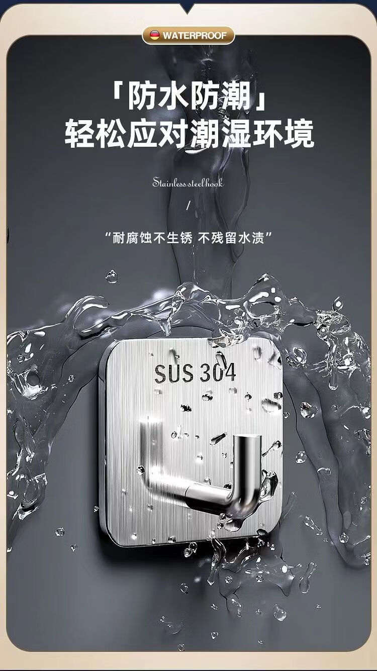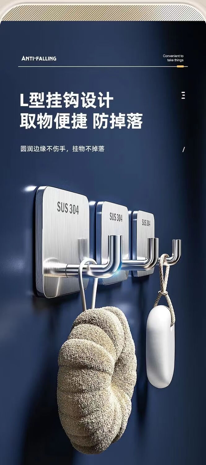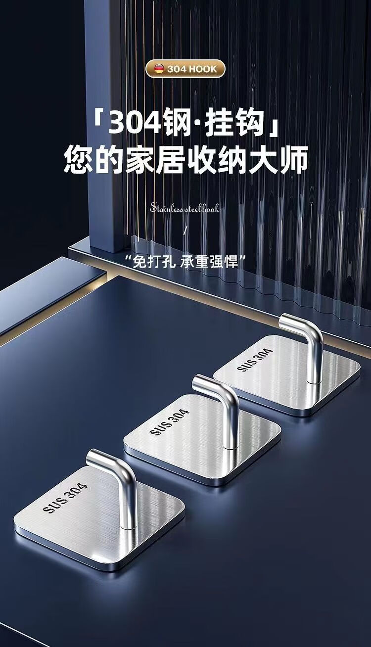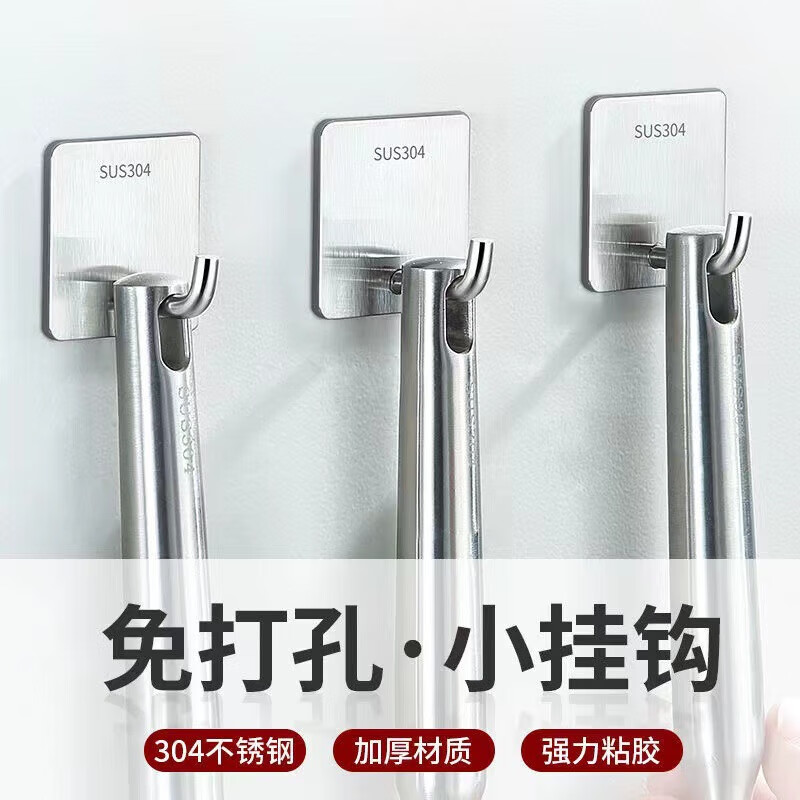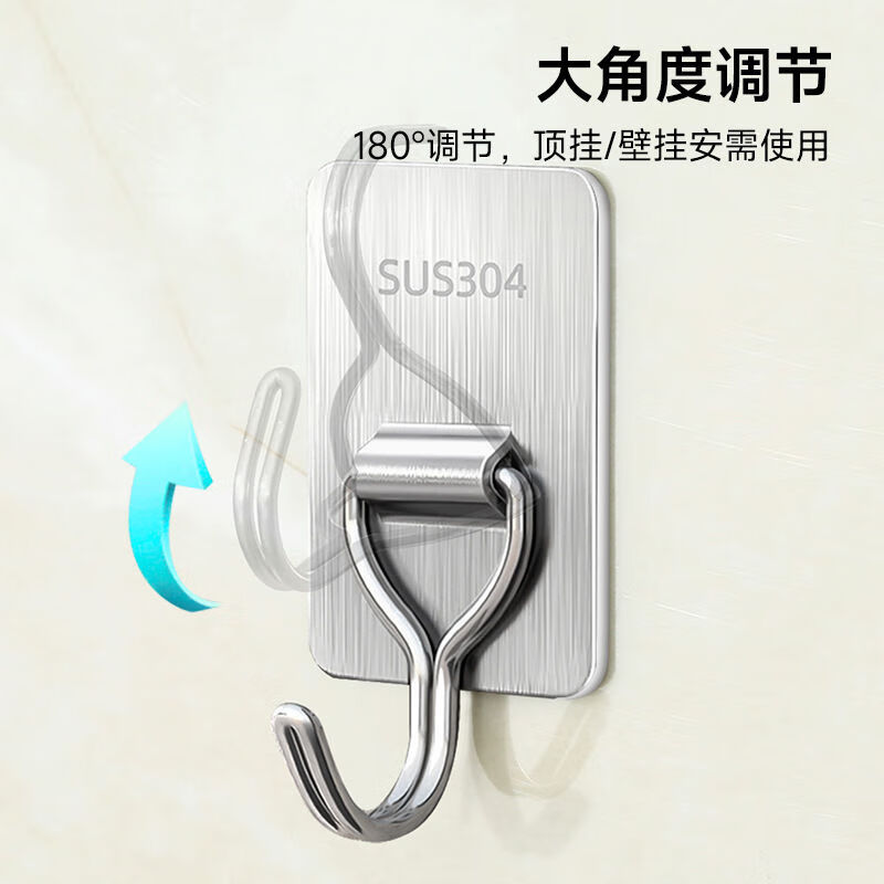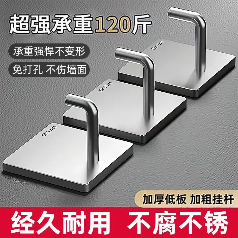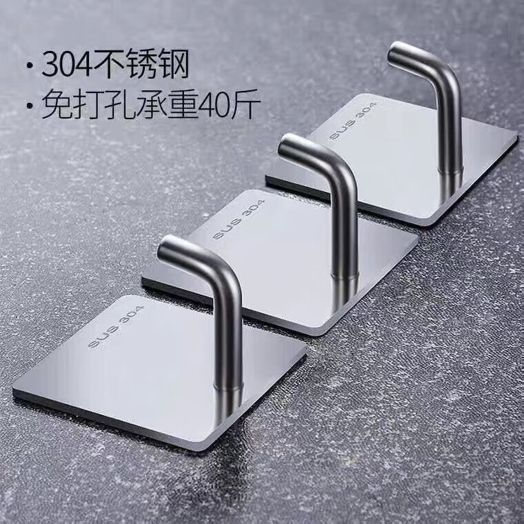 文教文化用品不锈钢挂钩强力承重免打孔粘钩家用浴室厨房墙上毛巾钩门后挂衣钩 正方形象鼻钩 4个挂钩配强力胶水+辅助贴